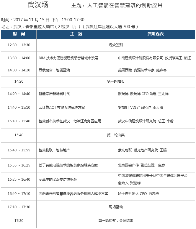 [導(dǎo)讀]武漢站將于11月15日(周三)下午在武漢香格里拉大酒店舉辦,主題為:人工智能技術(shù)在智慧建筑的創(chuàng)新應(yīng)用。