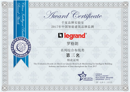 本次獲得“2017年十大綜合布線品牌獎”第三名,象征著羅格朗智慧的結晶和辛勤努力,希望在今天榮譽的推動下,未來將綻放更多的超越和突破。