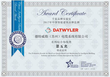 由千家智客主辦的“2017年中國(guó)智能建筑品牌獎(jiǎng)”頒獎(jiǎng)典禮于12月7日晚在廣州東方賓館隆重舉行。智能建筑領(lǐng)域重量級(jí)專家、品牌高層、業(yè)界主流媒體精英,齊聚一堂,共同見(jiàn)證了智能建筑行業(yè)領(lǐng)先企業(yè)耕耘行業(yè)一年來(lái)的榮耀收獲。素有智能建筑行業(yè)“奧斯卡”稱譽(yù)的“中國(guó)智能建筑品牌獎(jiǎng)”再一次隆重揭曉本年度獲獎(jiǎng)品牌,其中,百年品牌德特威勒被評(píng)選為“2017年度十大綜合布線品牌獎(jiǎng)”第五名。