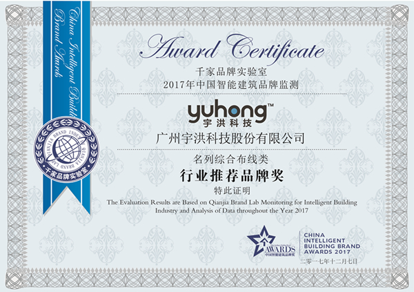 智慧傳輸倡導者!宇洪科技榮獲2017年綜合布線行業推薦品牌獎