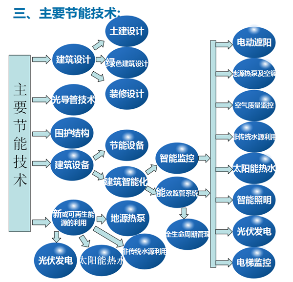 三、節(jié)能方面,包括斷橋鋁合金外窗及雙層中空玻璃,復(fù)合墻體與復(fù)合屋面保溫材料的選用;高效節(jié)能設(shè)備(如:能量回收系統(tǒng)、節(jié)能燈具、變頻電梯、光導(dǎo)管產(chǎn)品等)的選用;節(jié)能控制技術(shù)(電動(dòng)遮陽、空調(diào)自動(dòng)化系統(tǒng)、電梯群控等);可再生能源利用(太陽能、地源熱泵等)。