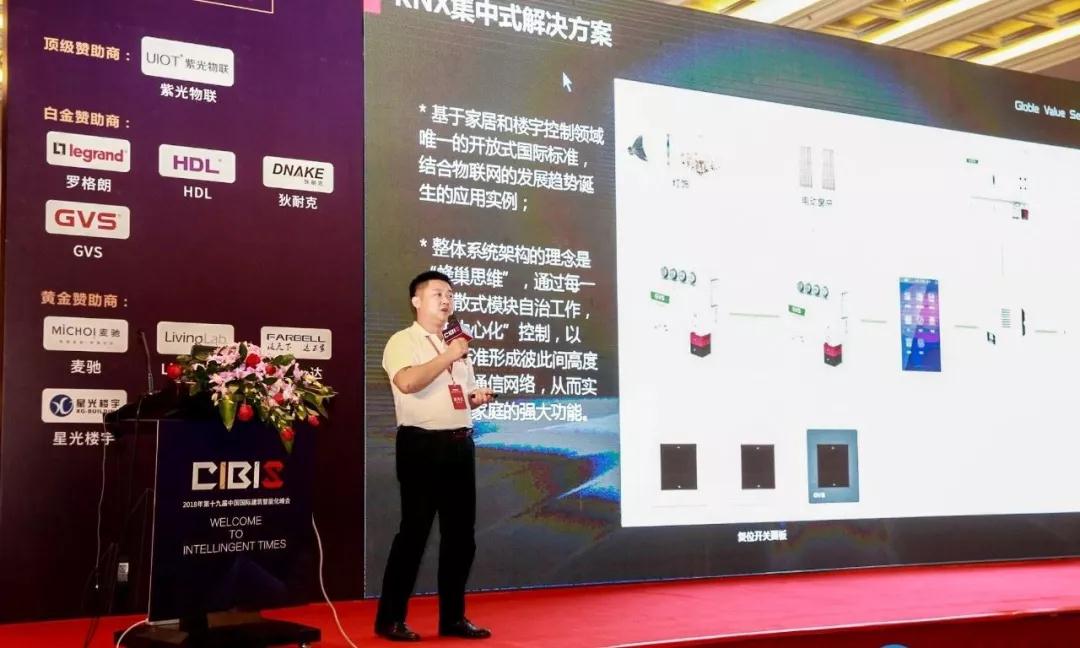GVS視聲智能家居事業部總經理張笛先生作為廠商代表第一個發言,并作《GVS智能家居的人性化設計》主題演講。他根據行業現狀及智能家居在地產方面的應用需求,通過精裝房、別墅、公寓等不同住宅類型,重點介紹了KNX分布式解決方案與KNX集中式解決方案及相關精品。