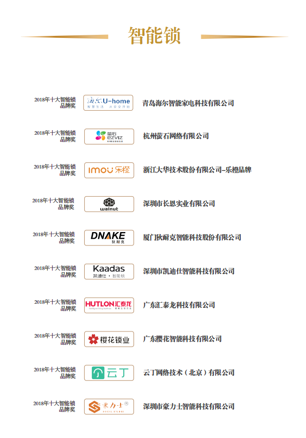 最終,十家品牌脫穎而出,斬獲“2018年十大智能鎖品牌獎”,榜單如下: