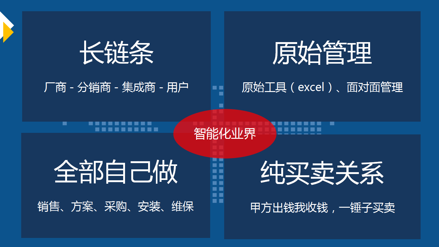 建筑智能化的長(zhǎng)鏈條涵蓋了廠商、分銷商、集成商、用戶等,廠家需要區(qū)域、省市代理,代理商需要集成商將產(chǎn)品賣給用戶,因而,構(gòu)成了建筑智能化的產(chǎn)業(yè)鏈。但目前,該領(lǐng)域還存在著不少問題,比如通過原始工具、面對(duì)面進(jìn)行管理;或者是銷售、方案、采購(gòu)、安裝、維保等親力親為,全部自己做;以及廠家和用戶的純買賣關(guān)系,甲方出錢再收錢,這是目前行業(yè)的普遍現(xiàn)狀。