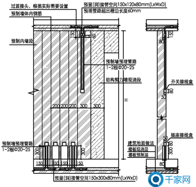 關于插座、開關預埋接線盒及其管路連接做法有一些規定,如接線盒和管路距預制段邊的距離需滿足結構專業要求;插座應布置在鋼筋之間,鋼筋間距符合結構鋼筋模數要求等。